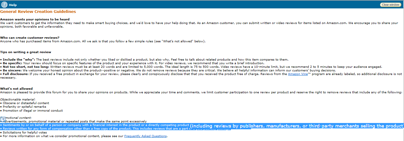 • Sentiments by or on behalf of a person or company with a financial interest in the product or a directly competing product (including reviews by publishers, manufacturers, or third-party merchants selling the product)