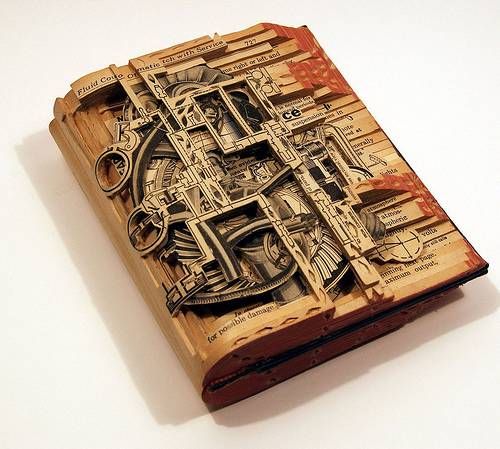 Using knives, tweezers and surgical tools, Brian Dettmer carves one page at a time. Nothing inside the out-of-date encyclopedias, medical journals, illustration books, or dictionaries is relocated or implanted, only removed.