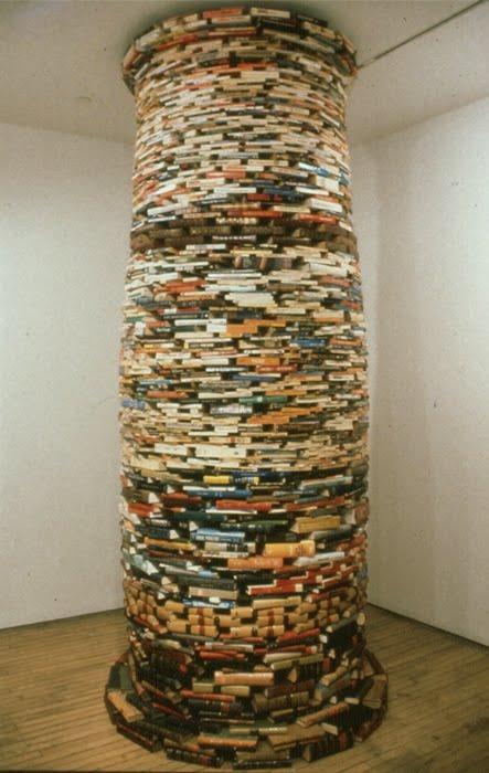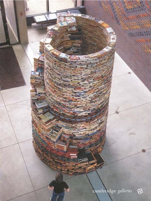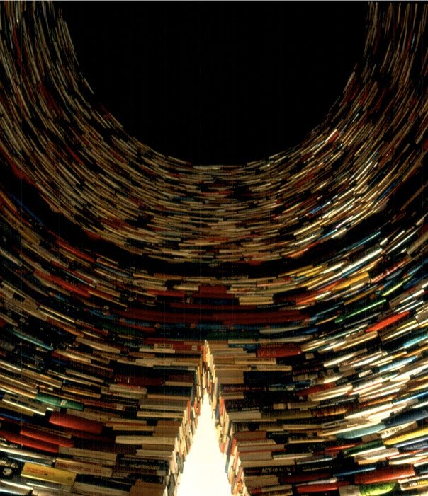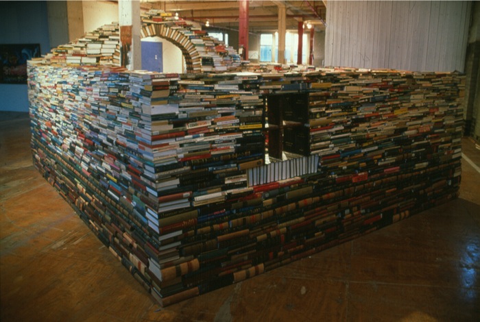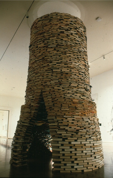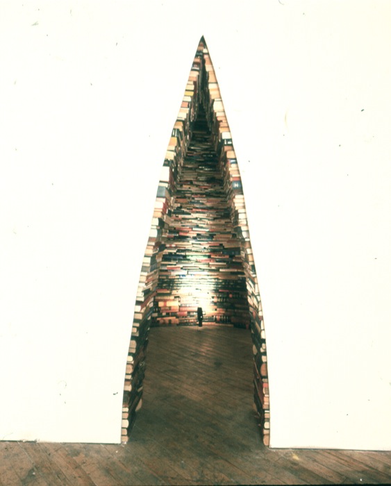 Well, artist Bendtsen. Bendtsen creates a series of architectural “installations ” using books. At first look these works may seem to be simply a pile of books though skillfully arranged to create a sculptural, architectural form. Upon a closer look one finds that titles of the books, the different types of books placed side by side, and on top of each other, creates the foundation and the structure. And each of these books is kept in specific manner to reflect upon the concepts that have preceded it as well as those surrounding it.